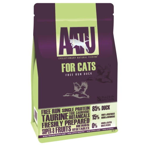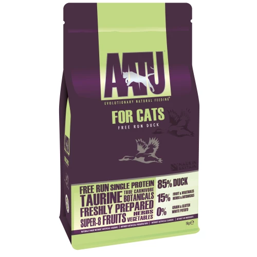 AATU Duck is an evolutionary natural feed for cats. Based on the knowledge that cat’s ancestors were natural predators. Modern cats are not that far removed from their ancestors, requiring a high meat diet and often referred to as obligate carnivores, which means, ‘by necessity.’ Simply put, cats must eat meat to survive – it’s a biological necessity! Cats also have the specific requirements for certain amino acids such as Taurine, Arginine and Tryptophan. High levels of these are naturally found in meat. This is the prime reason for the development of AATU for Cats, a bespoke and unique 85/15 diet, made up of 85% meat for your obligate carnivore!