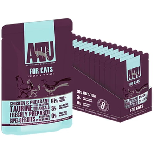 AATU For Cats Chicken & Pheasant Wet Pouches provides your cat with a single protein diet that is complete and balanced. Made with 97% freshly prepared preservative free meat and enriched with fruits, herbs and botanicals. Your cat will be licking his lips at every serving of the delicious AATU Chicken & Pheasant pouches! The recipe excludes grains, white potato and gluten – ingredients that are commonly known to cause allergic reactions. Handcrafted in small batch recipes, it’s naturally made without artificial colours, artificial preservatives and no GM ingredients!