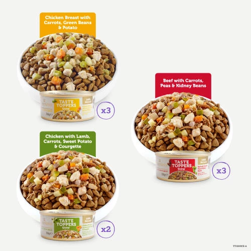 Applaws Taste Toppers Stew Selection Wet Dog Food will liven up your dog’s dry dog food with our Stew Selection packed with chunks of chicken breast, beef or lamb, with vegetables.