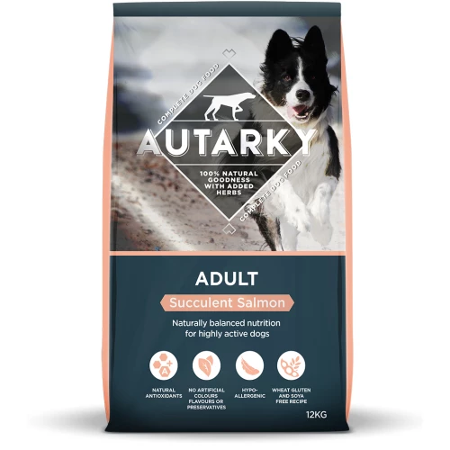 Autarky Salmon Dinner Adult Dog Food provides great levels of energy from fats and also contains key nutrients to help optimise fat utilisation from your dog’s diet. Made with hypo allergenic recipe that includes succulent salmon with rice, herbs and vegetables and contains no gluten, wheat, soya, artificial preservatives, colours or flavours. Formulated to promote overall well-being for the active adult dog.