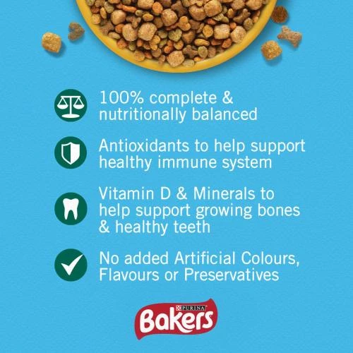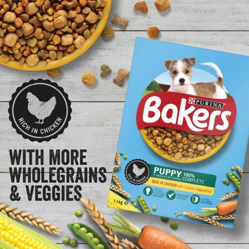 Bakers Chicken & Vegetable Puppy Food has a new, improved recipe that is now rich in chicken, with more variety of wholesome wholegrains & country vegetables for quality, tasty goodness. And don’t worry, our recipe is still made with the same amazing taste that our Bakers dogs know & love to gobble up! This recipe has been specially formulated to help your puppy grow up to be fit & healthy & contains the every day nutrients he needs to get on with all the playful & cheeky things that happy & healthy Bakers dogs love to get up to!