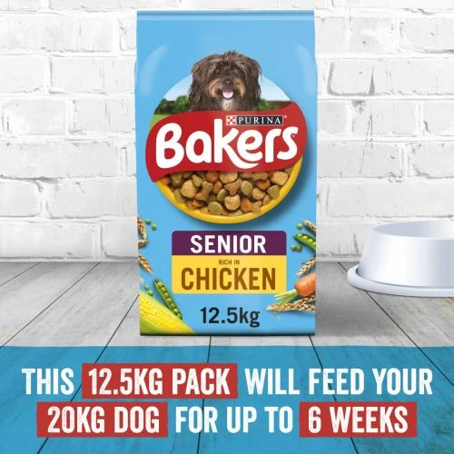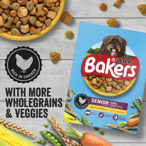 BAKERS SENIOR Chicken & Vegetable Dog Food has a new, improved recipe that is now rich in chicken, with more variety of wholesome wholegrains & country vegetables for quality, tasty goodness. And don’t worry, our recipe is still made with the same amazing taste that our BAKERS dogs know & love to gobble up!