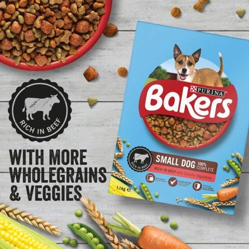 Bakers Complete Beef & Vegetable Small Breed Adult Dog Food has a new, improved recipe that is now rich in beef, with more variety of wholesome wholegrains & country vegetables for quality, tasty goodness. And don’t worry, our recipe is still made with the same amazing taste that our BAKERS dogs know & love to gobble up!