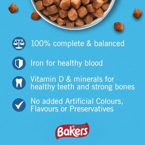 The Bakers story begins way back in 1851 when Edward Baker set up a family flour business. Fast forward to 1991 when BAKERS Complete was launched, because Edward Baker believed that dry dog food should be every bit as tasty as it is nutritious. Our recipe has been made with a variety of tender* meaty chunks & wholegrains for quality, tasty goodness.Each meal contains the every day nutrients your dog needs to get on with all the playful & cheeky things that happy & healthy BAKERS dogs do! *softness varying with time