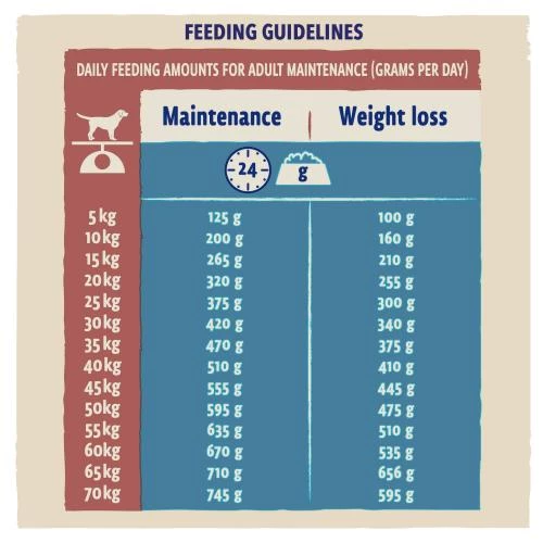 Dog Body Weight: 25 kg, To Maintain Current Body Weight (gr/per day): 340 g, Weight loss (gr/per day): 275 g