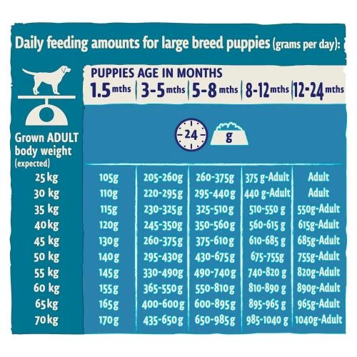 Daily feeding amounts for large breed puppies (grams per day):