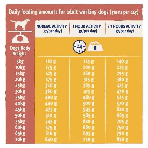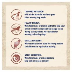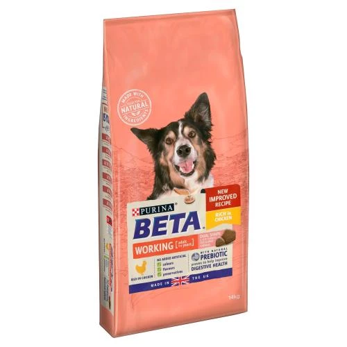 BETA Working with Chicken Adult Dog Food helps our pooches to live an active life unleashed – they need food that can properly fuel their natural enthusiasm for life!. That’s why PURINA BETA naturally tailored nutrition for working dogs includes essential amino acids and high level of antioxidants to support muscle health and to help him stay in great condition during highly challenging active periods. It is also specially formulated with selected natural ingredients and a natural prebiotic to help support digestive health, that helps your adventurous dog to enjoy his active life every day. And all this without including any added artificial colours, flavours or preservatives.