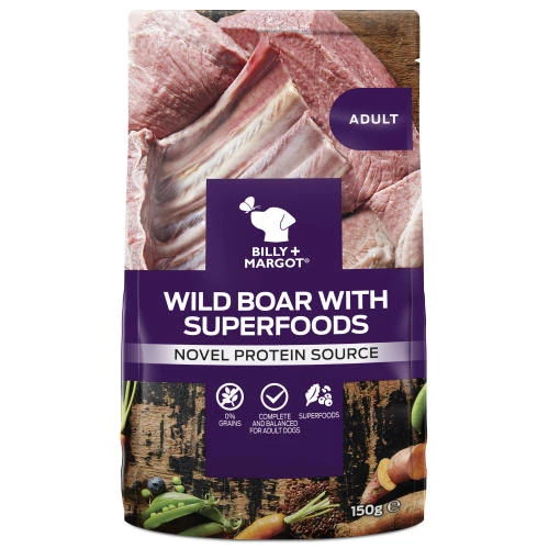 Billy & Margot Wild Boar Superfood Wet Dog Food Pouches are nutritiously delicious.