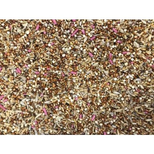 Red Dari, Naked Oats, White Dari, Sunflower Hearts, Red Millet, Yellow Millet, Canary Seed, Kibbled Peanuts, Pinhead Oatmeal, Nyjer Seed, Hempseed, Suet Pellets.