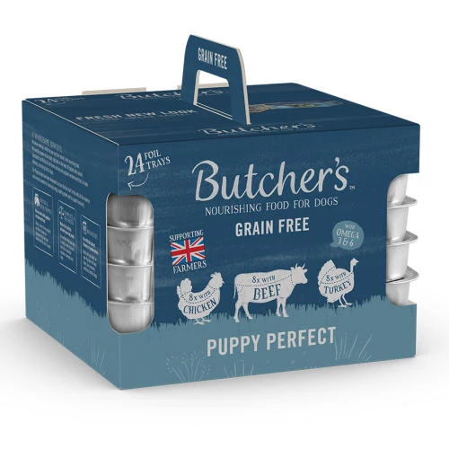Butchers Perfect Puppy Trays Wet Puppy Food contains 3 mouthwateringly delicious flavours that are bursting with all the essential nutrients that puppies need for bouncing energy and healthy growth. This is a grain free recipe.
