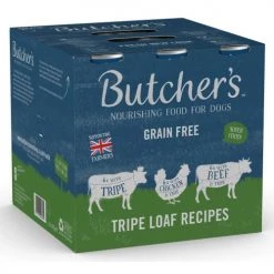 Butchers Tripe Loaf Recipes Wet Dog Food contains 3 mouthwateringly delicious flavours that are bursting with all the essential nutrients that dogs need to be at their best. What’s more, each recipe is packed with high-quality protein, calcium for strong bones and Vitamins A and B12, and the all-important omega-3 and omega-6 to support the immune system and promote healthy skin and coat. These recipes are grain free.