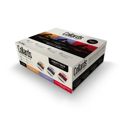 Collards Variety Pack Wet Adult Dog Food is a delicious and complete set of dog foods that are full of flavour and nutrition. Contains 3 scrumptious flavours: Lamb with Rice, Duck with Rice, Turkey with Rice – they’re all sure to set your dog’s tail wagging!
