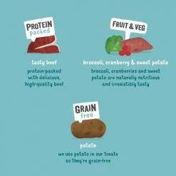 This grain-free recipe is made using the finest cuts of beef and naturally nutritious broccoli, strawberry and sweet potato. As a result, they’re packed full of low-fat protein, vitamins and minerals and – like all our treats – they’re brilliantly tasty. Everything is gently cooked and carefully packed in a 100% biodegradable bag.