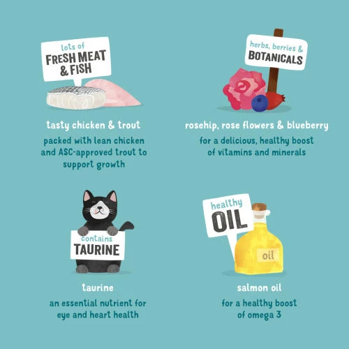This recipe is perfect for younger cats. The chicken and trout are high in protein, which kittens need to grow up big and strong. No matter how cute they look, cats are carnivores, so we make sure our kitten recipes have at least 65% meat or fish. And, because they’re very sensory animals, we add lots of healthy extras, like vitamin-rich berries, herbs and botanicals. This is a grain-free recipe and is suitable for neutered cats.