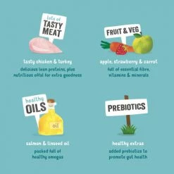 Chicken 59%, turkey 8%, carrot 2%, tomato 1%, apple 1%, minerals, blueberries 0.8%, mannan-oligosaccharides (MOS), linseed oil 0.25%, salmon oil 0.2%, fructo-oligosaccharides (FOS), strawberries 0.1%, mango 0.1%, dried nettle, dried fennel, dried caraway, dried yarrow, dried blackberry leaves, dried mistle, dried chamomile blossoms, dried gentianroot, dried centaury