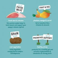 This kibble is the world’s first to be made direct from fresh duck & chicken with no duck/chicken meal or dried chicken/duck, so it’s packed with the very best protein. This means it is highly nutritious and easily digestible. Every pack bursts with tasty veggies, fruit and botanicals, giving me all the vitamins, minerals and antioxidants I need to keep me healthy nose to tail.