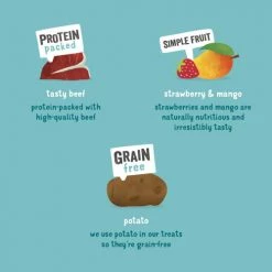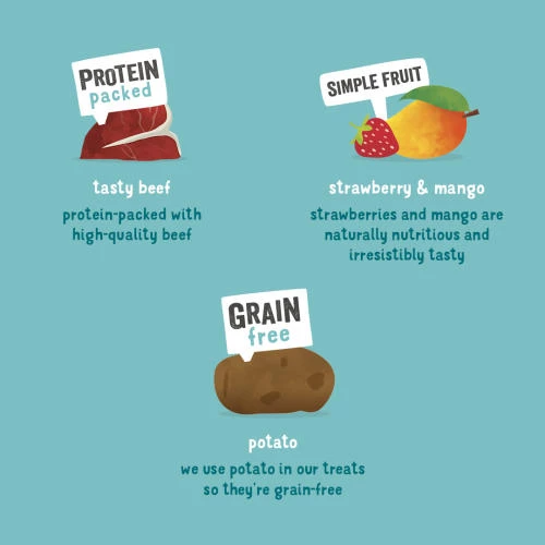 These grain-free bites are full of simple, irresistible, healthy ingredients. We source the best cuts of beef for full-on taste and high-quality protein. Then we ramp it all up with strawberry and mango (which just so happen to be bursting with natural vitamins and minerals). Everything is carefully cooked and packed (in a 100% biodegradable bag).