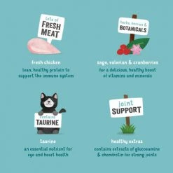 fresh chicken 60%, sweet potatoes, peas, pea protein, chicken gravy, chicken fat, linseed, minerals, mannan-oligosaccharides (MOS), fructo-oligosaccharides (FOS), sage 0.03%, valerian 0.03%, cranberries 0.03%, fennel 0.03%, watercress 0.03%, catmint 0.03%, glucosamine, chondroitin sulphate