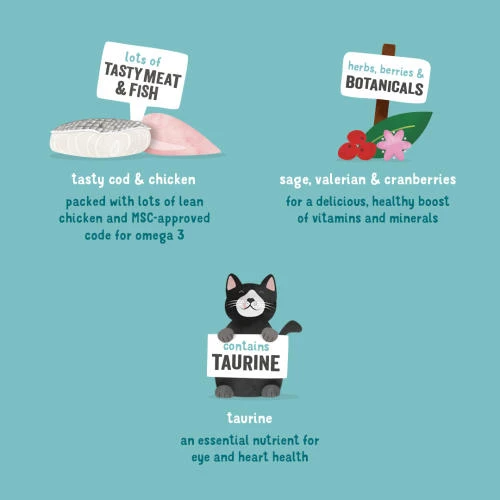 chicken 54%, MSC* codfish 6%, minerals, cranberries 0.25%, sage 0.13%, valerian 0.13%.