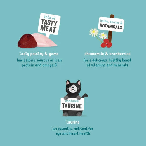 This recipe is packed with goodness and is suitable for all and any cats. The poultry and game are low-calorie sources of lean protein and omega-6. Cats are carnivores, so we make sure our recipes have at least 60% meat. Cats can also be picky eaters, so we include other carefully-chosen ingredients to further tempt the taste-buds of your feline friends. This recipe is suitable for neutered cats.
