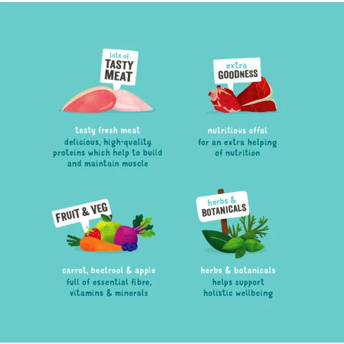We only use fresh meat in our food – meaning nothing processed or dried, and absolutely no meal or bone. By mixing in a few tasty extras, like lots of healthy fruit, veg and berries, we’ve created a well-balanced food that gives dogs everything they need. Packaged in 100% recyclable materials, it’s naturally tasty dog food that you, your pets and our planet can feel good about.