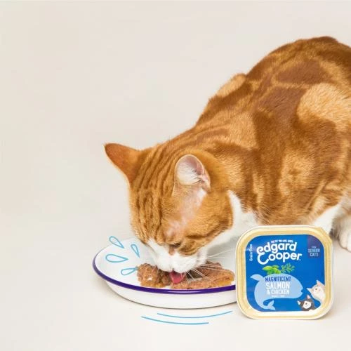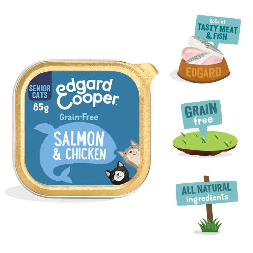Edgard & Cooper Salmon & Chicken Wet Senior Cat Food is a delicious, naturally low-calorie cat food made using fresh chicken and salmon for a taste your senior cat will love!