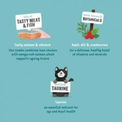 This recipe is perfect for older cats (or cats on a diet). The chicken and salmon are high in protein and low in calories, which means they provide the right nutrition for less energetic cats. Salmon contains lots of omega 3, which helps support ageing brains. What’s more, the cranberries in this recipe support urinary health – which can be an issue for senior cats. Cats are carnivores, so all our recipes are made with at least 60% meat or fish. This recipe is suitable for neutered cats.