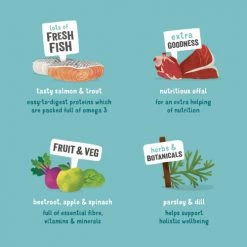 Every tray of Edgard & Cooper Salmon & Trout Grain Free Wet Adult Dog Food is bursting with tasty veggies, fruit and botanicals, giving your pooch all the vitamins, minerals and antioxidants they need to keep healthy from nose to tail. This grain free recipe is gluten free and contains natural prebiotics so it is good for sensitive tummies.