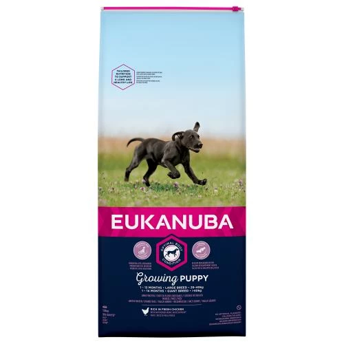 Eukanuba for Large & Giant breed puppies is a complete pet food for growing dogs containing a finely tuned balance of vitamins and minerals. Specially developed for puppies expected to weigh over 25kg in adulthood, Eukanuba Large Puppy contains carefully adjusted protein and calcium to help encourage stable, sustained growth, with strong bones and lean muscle.
