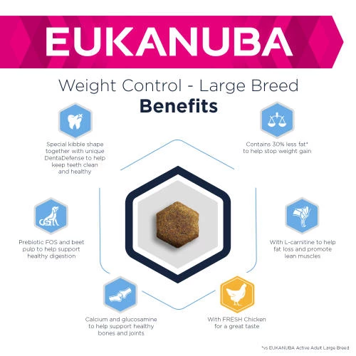 Eukanuba Weight Control Large Breed Adult Dog Food is a complete, low fat food for adult dogs that may be predisposed towards weight gain. With 30% less fat, Eukanuba Adult Dry Dog Food for Large Breeds Weight Control is ideal to help your large dog maintain a healthy weight. Ideal for large dogs such as German Shepherds, Labradors, Rottweilers and Golden Retrievers, with a tendency to be overweight.