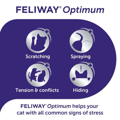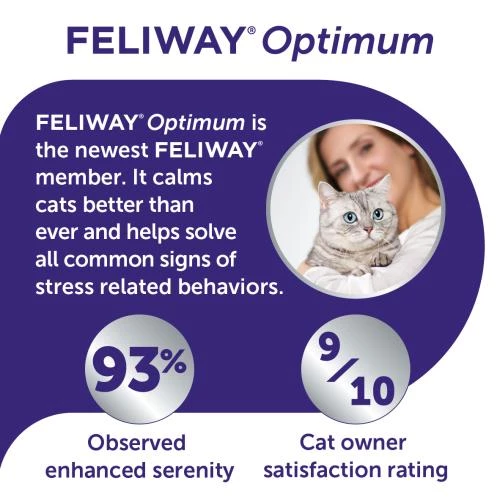 Feliway Optimum Cat Calming Diffuser Starter Pack is the latest edition to the Feliway range and now calms cats better than ever before and in more situations for enhanced serenity. It contains a new feline pheromone complex that conveys even more impactful messages to your cat which helps them cope with our modern lifestyles. Feliway Optimum contains the most advanced Feline Pheromones Complex, developed by the Feliway research team.