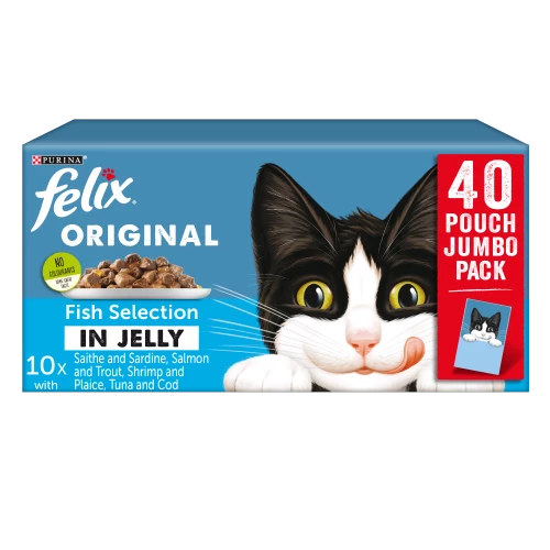 Individually foil sealed to keep in the taste cats love, each pouch is a perfect balance of delicious flavour & convenience; just snip it open, pour out the succulent meaty chunks smothered in jelly, & let your cat become a Felix cat! With a mouth watering selection of flavours like Tuna & Cod, Salmon & Trout, Shrimp & Plaice, and Pollack & Sardine, Felix cats are spoiled for choice!