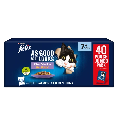 Felix As Good As It Looks’ delicious Favourites Selection, formulated especially for senior cats (aged 7 and over), is so irresistible your cat won’t be able to wait for the bowl to hit the floor! Did you know that 40% of your cat’s life is spent as a senior? And as your cat starts to get on in years, their dietary needs will change too.