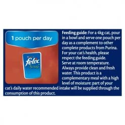 For a 4 kg cat, pour in a bowl and serve one pouch per day as a complement to other complete products from Purina. Serve at room temperature. Always provide clean and fresh water. This product is a complementary meal with a high moisture content: part of your cat’s daily water recommended intake will be supplied through the consumption of this product.