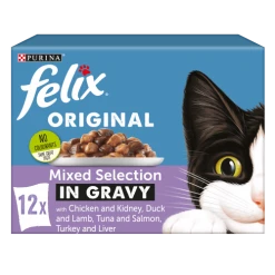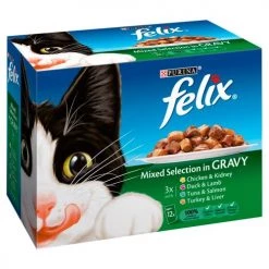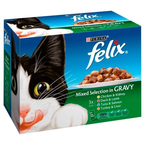 Individually foil sealed to keep in the taste cats love, each pouch is a perfect balance of delicious flavour & convenience; just snip it open, pour out the succulent meaty chunks smothered in thick gravy, & let your cat become a Felix cat! With a mouth watering selection of flavours like Duck & Lamb, Turkey & Liver, Tuna & Salmon, and Chicken & Kidney, Felix cats are spoiled for choice!