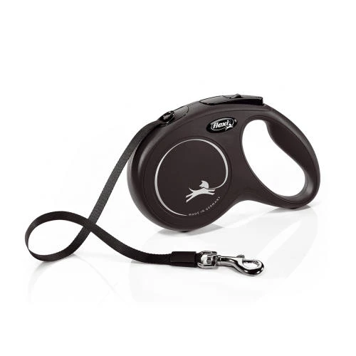 The Flexi New Classic Black Tape Dog Lead features an innovative braking system that creates a high level of safety and comfortable handling during walks. Intuitive handling, thanks to convenient brake button and ergonomic grip handle. Also features a chromed snap hook. Reflective protector belt for improved visibility in the dark. Made in Germany.