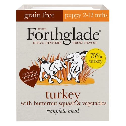 Forthglade Complete Grain Free Turkey, Butternut Squash & Veg Puppy Food is suitable for puppies aged between 1 – 12 months old. Free from artificial colours, flavours, preservatives & ingredients known to cause allergies such as wheat & gluten. Forthglade is a highly digestible food containing proteins, vitamins, minerals and carbohydrates to maintain your puppies start in life. The formulation contains Glucosamine and Chondroitin which promotes suppleness and healthy joints, and seaweed which provides your dog with important trace elements.