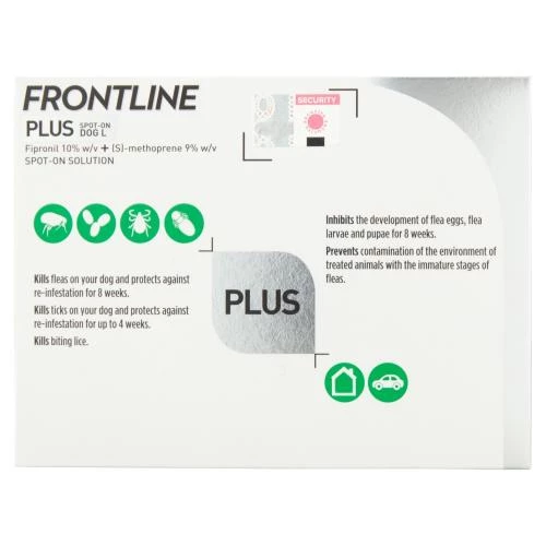 FRONTLINE Plus Flea & Tick Spot On Treatment for Dogs kills fleas, ticks and lice and stops flea eggs hatching in your home. It is fast acting and kills fleas within 24 hours and ticks within 48 hours. Frontline Plus also attacks eggs and larvae to keep your pet parasite free for longer.