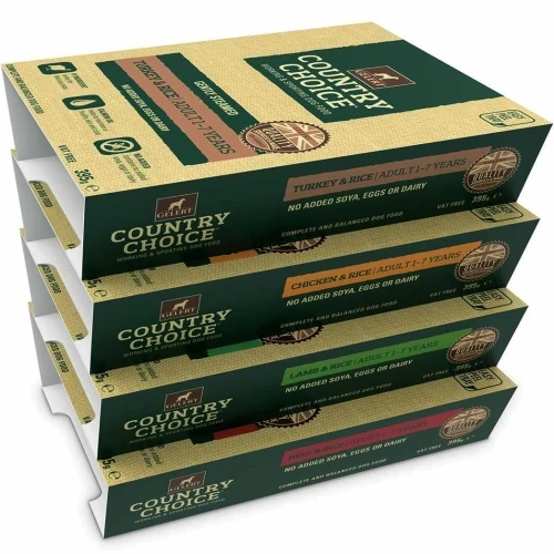 Gelert Country Choice tray varieties contains all four of the wet tray selection flavours. Each tray uses the named ingredients as its number one ingredient, providing plenty of protein and other important nutrients. Free from dairy, soya and egg. Feed these trays as a meal on its own or mix with biscuits. Flavours include: Chicken & Rice, Lamb & Rice, Beef & Rice and Turkey & Rice.