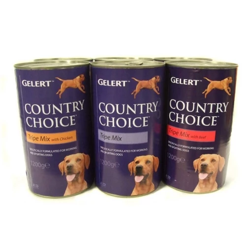 Gelert Country Choice Adult Dog Tripe Variety is a selection of 3 lip-licking recipes that incorporates pure green beef tripe, this is known as a super food in the raw feeding community. Green tripe, this is a tripe which has been unbleached, therefore it maintains its nutritional values & meaty taste that dogs love. Each of these recipes have been formulated to fit the nutritional needs of highly active or working dogs who require a high protein wet food to accompany their dry rations.