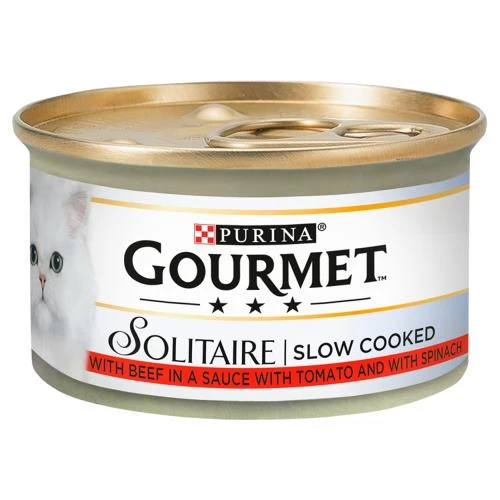 Gourmet Solitaire is an elegant recipe prepared with prime beef & tomato for an exquisite & nutritionally complete cat food, even the most discerning connoisseur will find it completely irresistible! Treat your furry sophisticate every day with these select morsels of moist meat, cooked in a luxuriant rich tomato sauce for a meal to exceed the expectations of the most highly refined feline.