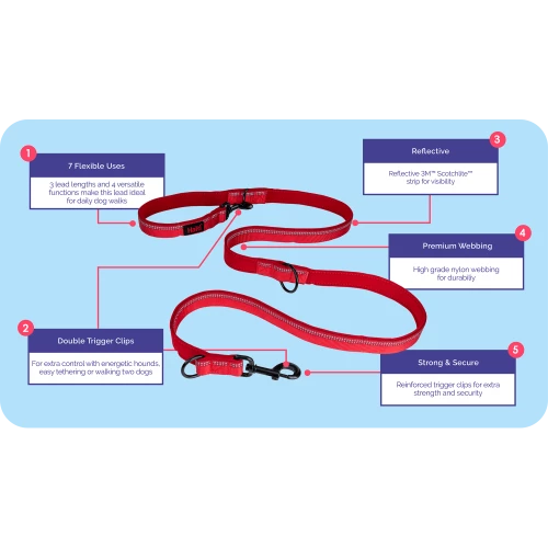 This lead has 3 variable length positions so it can be used as a short dog lead in busy areas, or a long dog lead, up to 2m, when there’s more space. The trigger clips are reinforced and incredibly strong to give you complete peace of mind.