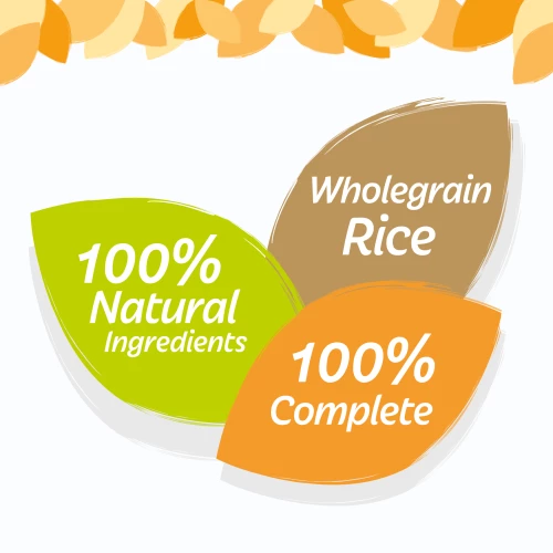 Chicken with wholegrain rice, peas and pumpkin – Chicken (50%), cooked wholegrain brown rice (4%), peas (4%), pumpkin (4%), sunflower oil (2%), fish oil (0.5%), minerals, chicory extract (300 mg/kg), seaweed extract (200 mg/kg), yucca extract (50 mg/kg).