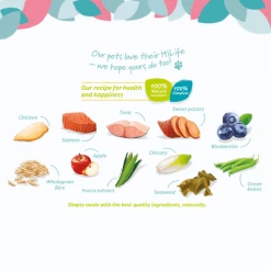 Chicken with salmon, wholegrain rice, sweet potato and blueberries: Chicken (46%), salmon (4%), cooked wholegrain brown rice (4%), sweet potato (4%), blueberries (4%), sunflower oil (1%), minerals, fish oil (0.2%), chicory extract (300 mg/kg), seaweed extract (200 mg/kg), yucca extract (50 mg/kg).