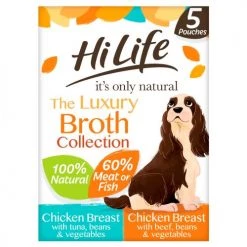 The HiLife Its Only Natural Luxury Broth Collection Wet Dog Food is a selection of delicious, grain free chicken recipes that’s sure to set your pooch’s tail wagging. What’s more, they’re made with 100% natural ingredients and include no artificial flavours, colours or preservatives.