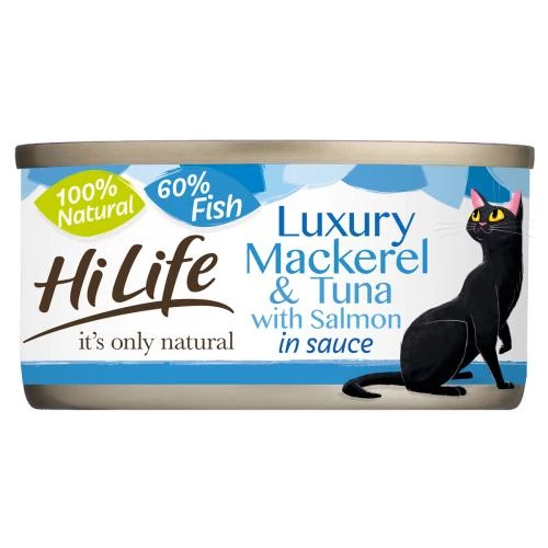 HiLife Its Only Natural Luxury Fish Selection in Sauce Wet Cat Food contains 3 different and equally delicious recipes to give your kitty some real variety. Each recipe is made with 100% natural ingredients and is grain free. What’s more, they’re free from artificial colours, flavours or preservatives.