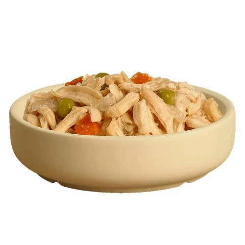 Ingredients (Chicken breast with carrots & peas): Chicken breast (55%), carrots (10%), beans (10%), peas (5%), dolphin-safe tuna (5%)