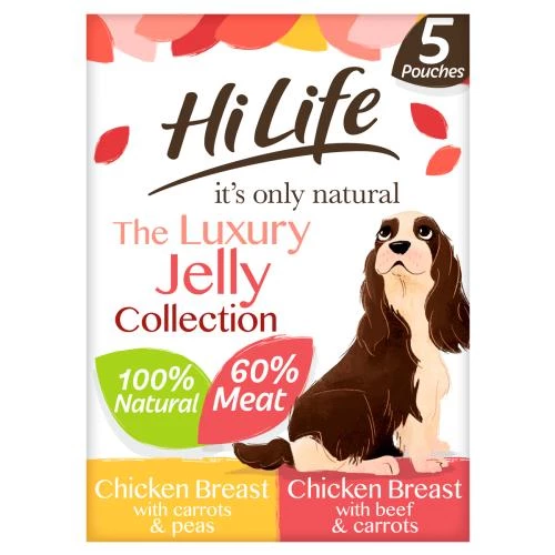 The HiLife Its Only Natural Luxury Jelly Collection Wet Dog Food is a selection of delicious, grain free chicken recipes that’s sure to set your pooch’s tail wagging. What’s more, they’re made with 100% natural ingredients and include no artificial flavours, colours or preservatives.