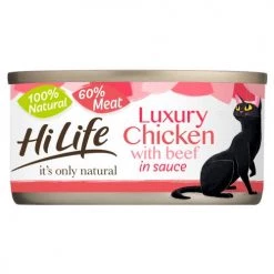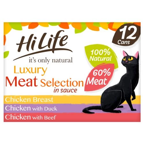 HiLife Its Only Natural Luxury Meat Selection in Sauce Wet Cat Food contains 3 different and equally delicious recipes to give your kitty some real variety. Each recipe is made with 100% natural ingredients and is grain free. What’s more, they’re free from artificial colours, flavours or preservatives.