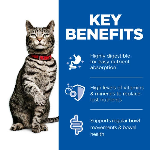 Suitable for: Kittens and Adult Cats for: Acute gastroenteritis (diarrhoea or vomiting). Constipation (motility impaired). Exocrine pancreatic insufficiency (EPI). Gastritis (acute or chronic). Gastrointestinal disorders in kittens. Oesophageal disorders. Pancreatitis. Recovery from gastrointestinal surgery. Growth. Neoplasia, most forms.